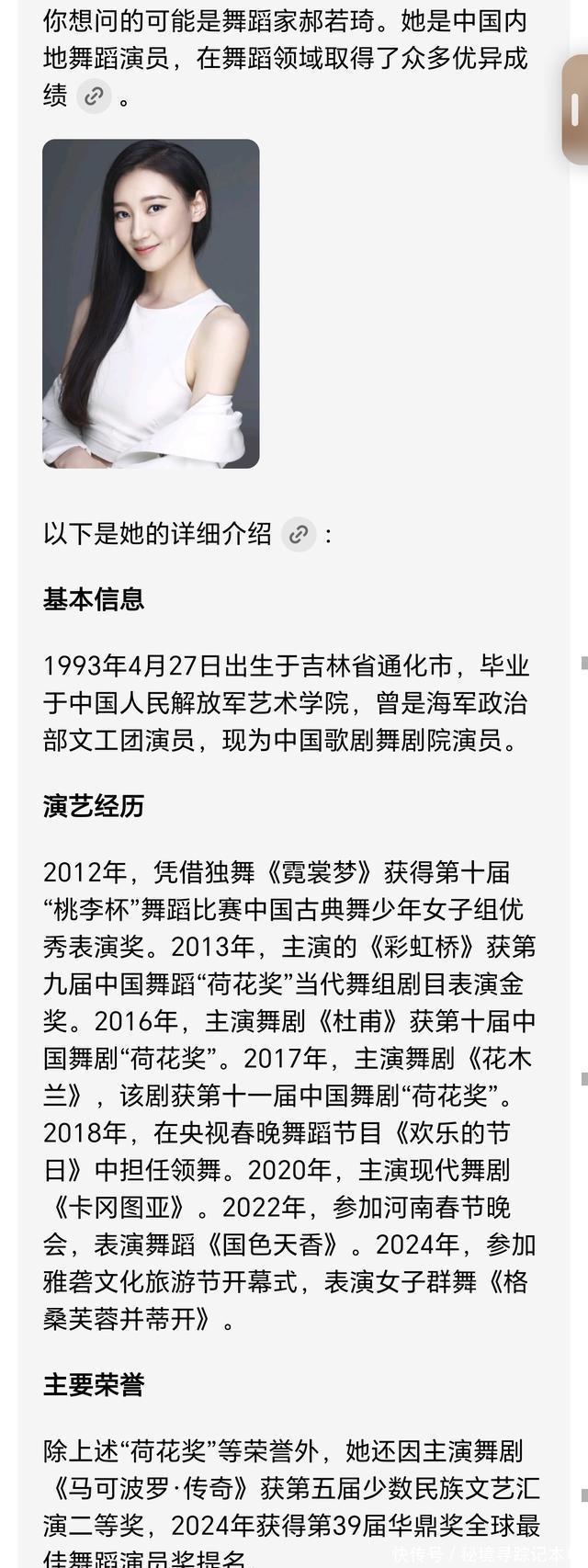 但宇辉这次还邀请了两位女嘉宾“舞蹈家郝若琦”和“演员姜贞羽”,相信大家都会感到比较陌生,因为这两位之前大家都没有怎么听过。看到这两位女嘉宾后,小编也特意去查询了一下,才知道:郝若琦是1993年4月27日出生于吉林省通化市,毕业于中国人民解放军艺术学院,曾是海军政治部文工团演员,现为中国歌剧舞剧院演员,她的代表作有2012年,凭借独舞《霓裳梦》获得第十届“桃李杯”舞蹈比赛中国古典舞少年女子组优秀表演奖等荣誉。