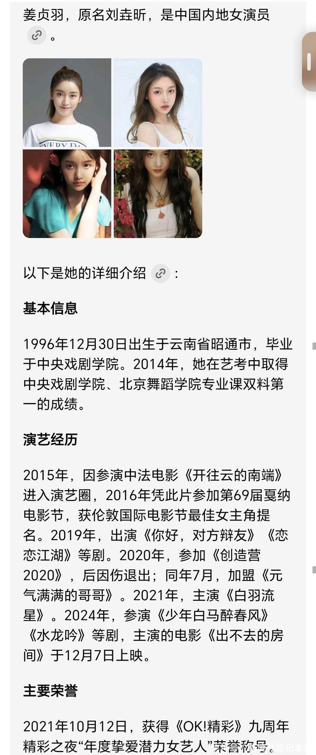 而青年演员姜贞羽,则是1996年12月30日出生于云南省昭通市,今年才29岁,可见很年轻,她毕业于中央戏剧学院。2014年,她在艺考中取得中央戏剧学院、北京舞蹈学院专业课双料第一的成绩。在2015年,她因参演中法电影《开往云的南端》进入演艺圈,2016年更是凭此片参加第69届戛纳电影节,获伦敦国际电影节最佳女主角提名,颇有出道即巅峰之感。